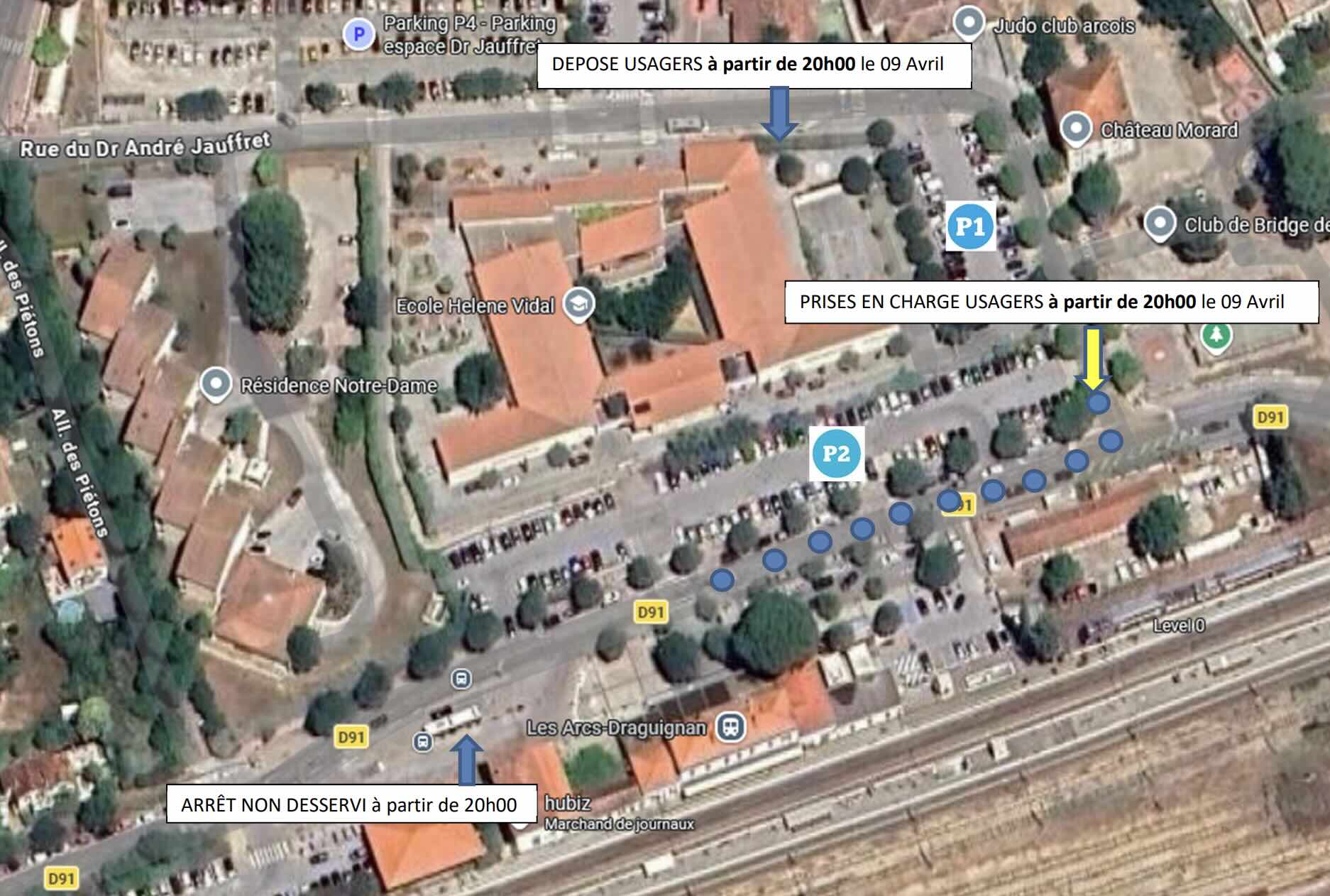 ➡ Prise en charge (départs)Intersection rue du Dr Jauffret / D91 (entrée parking P1)🕒 20h15 – 21h00 – 21h30